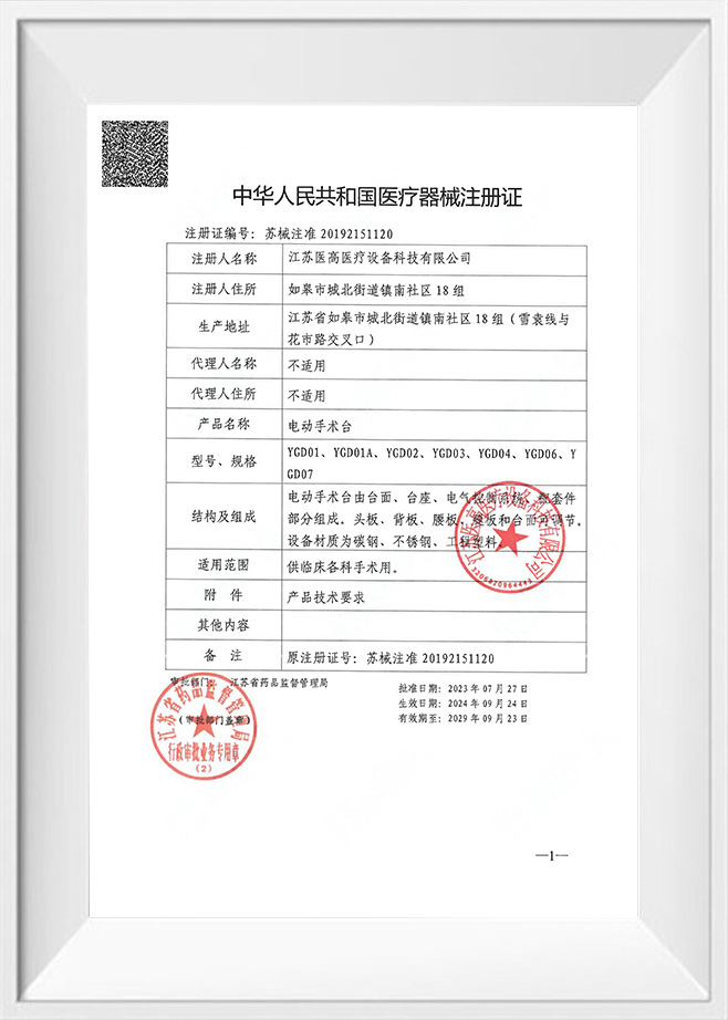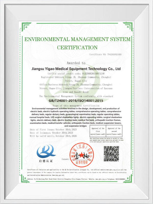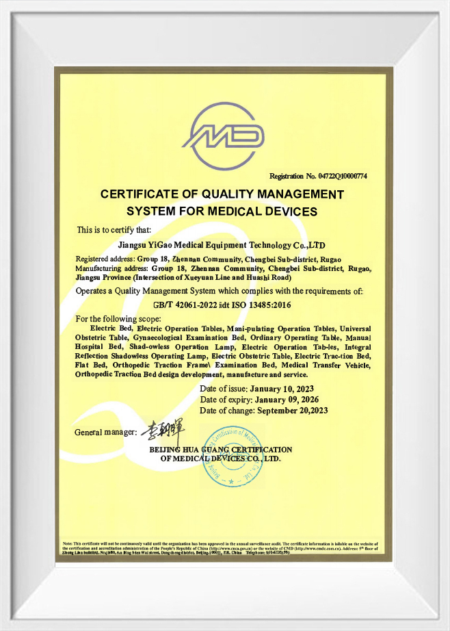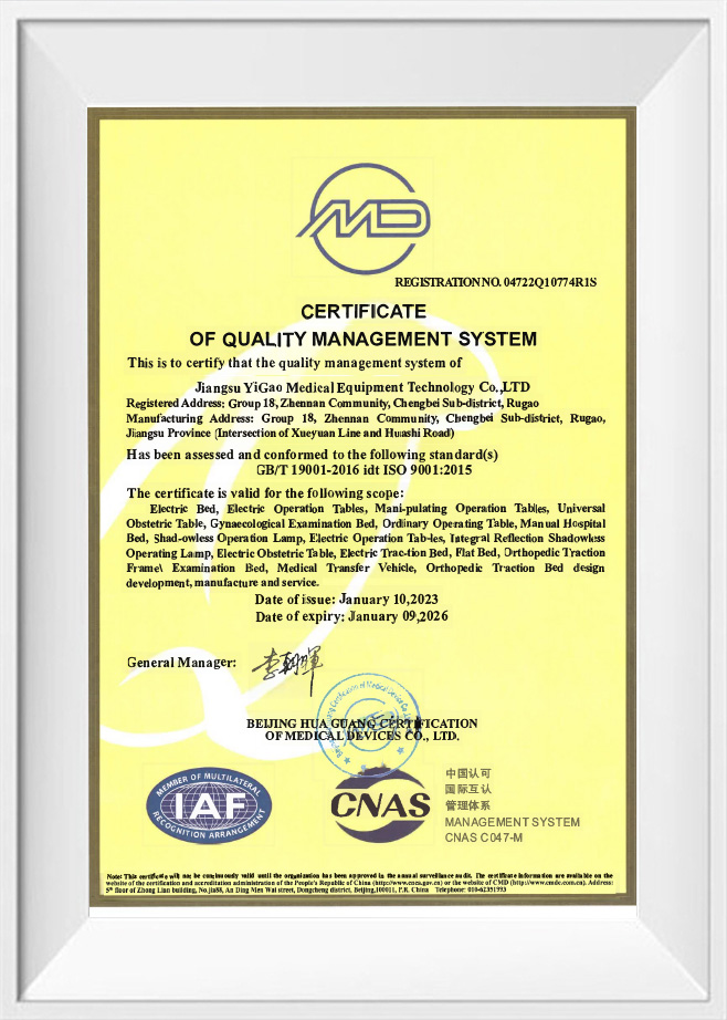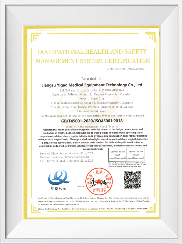 Als een onderneming die voorbij is ISO 9001, ISO13485, ISO 14001, ISO 45001 en andere managementsysteemcertificeringen beschouwt Jiangsu Yigao Medische Apparatuur Technologie Co., Ltd. de productkwaliteit als haar levensader. Onze operatietafels voldoen hier strikt aan CE-normen , wat betekent dat ze niet alleen voldoen aan de veiligheids-, gezondheids- en milieueisen van de Europese markt, maar ook het internationale leidende niveau vertegenwoordigen op het gebied van productontwerp en productie.