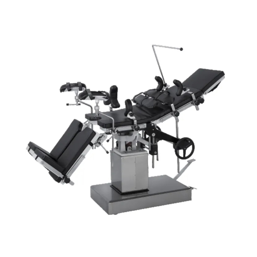 YGS3001A Orthopedie hydraulische operatietafel is een krachtig medisch apparaat ontworpen voor orthopedische chirurgie. Het heeft een solide structuur en flexibele aanpassing en kan patiënten stabiele ondersteuning en nauwkeurige positie-aanpassing bieden. De operatietafel bestaat uit een hoofdbord, achterbord, taillebord, scheepsbord en gedeeld beenbord. Het heffen, kantelen en afstellen van elk onderdeel kan nauwkeurig worden geregeld door handbediende tandwielen, wormwieloverbrengingen en reksystemen om het comfort en de stabiliteit van patiënten tijdens de operatie te garanderen. Het hydraulische hefsysteem wordt aangedreven door een voetbediende hydraulische pomp, die eenvoudig en stabiel te bedienen is en kan voldoen aan de behoeften van frequente aanpassingen. Het tafelblad van de operatietafel is gemaakt van koolstofstaal met een spuitcoating, dat corrosiebestendig en gemakkelijk schoon te maken is, terwijl de basis en de kolombehuizing van roestvrij staal zijn gemaakt om langdurig en stabiel gebruik van de apparatuur te garanderen.