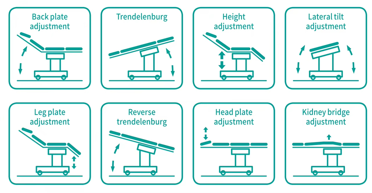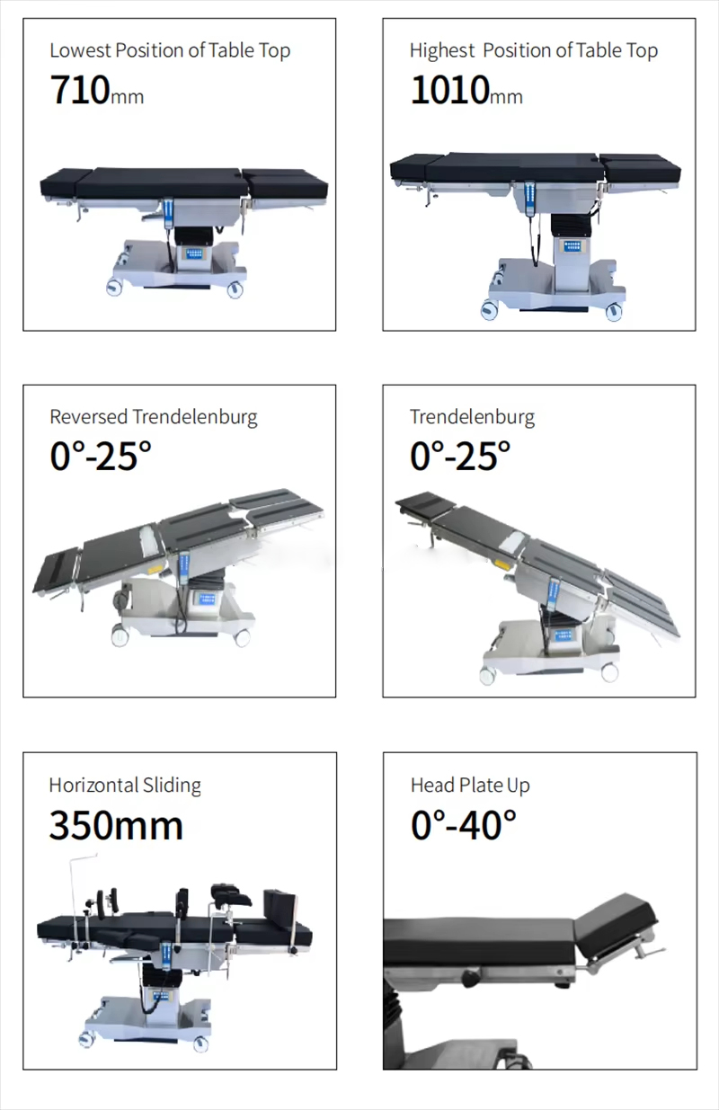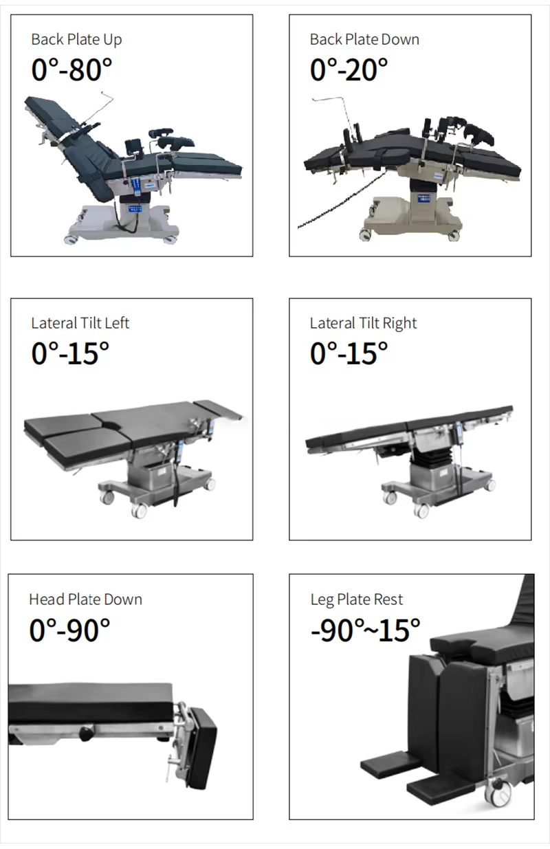 De tafel is verdeeld in vier secties: hoofd, rug (inclusief heupbrug), heup en been. Het tafelblad is gemaakt van hoogwaardig composietmateriaal met röntgentransmissie; Er kan worden samengewerkt met een C-arm om foto's te maken.
